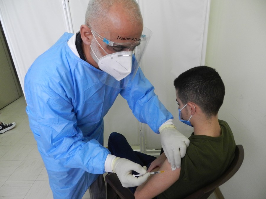 A student gets inoculated with the first dose of COVID-19 vaccine in Hasbaya, southern Lebanon, Jan. 5, 2022. (Photo by Taher Abu Hamdan/Xinhua)■