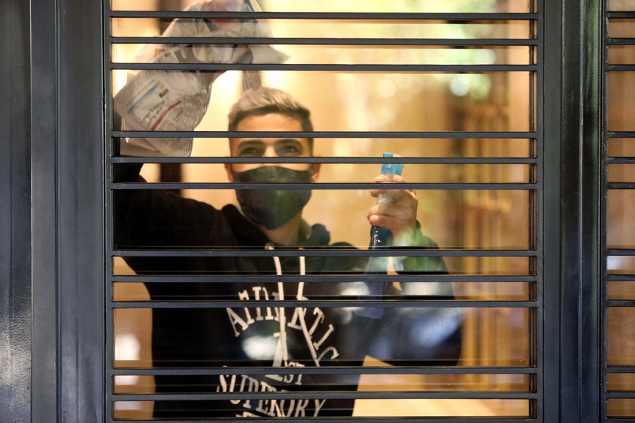 A man wearing a face mask cleans a window in Beirut, Lebanon, on Jan. 7, 2022. (Xinhua/Bilal Jawich)
