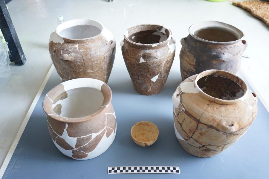 File photo shows potteries found at an ancient tomb in Beihai City, south China's Guangxi Zhuang Autonomous Region. Archaeologists recently discovered a large-scale cluster of ancient tombs dating back to the Six Dynasties period to the Sui and Tang Dynasties (222-907) in Dashugen Village, Fucheng Township of Beihai City. (Beihai Museum/Handout via Xinhua)