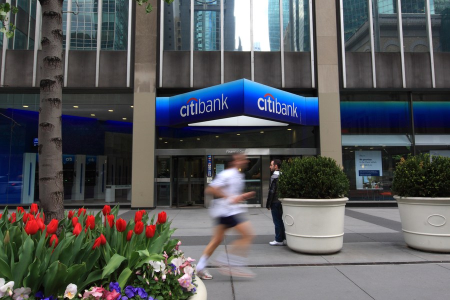 File photo taken on April 19, 2010 shows a man running past a branch of Citibank in New York, the United States. (Xinhua/Wu Kaixiang)