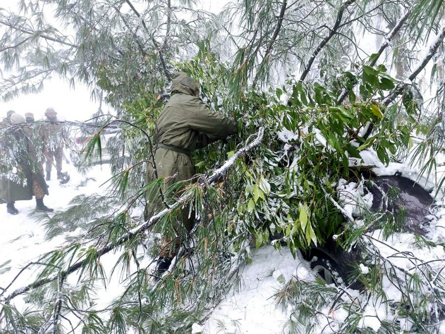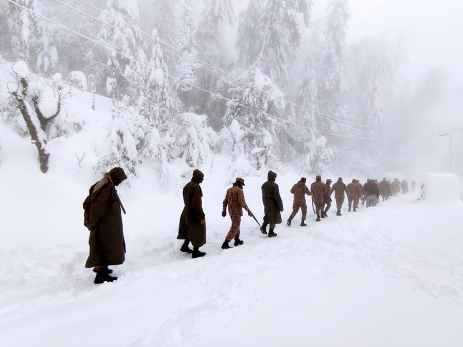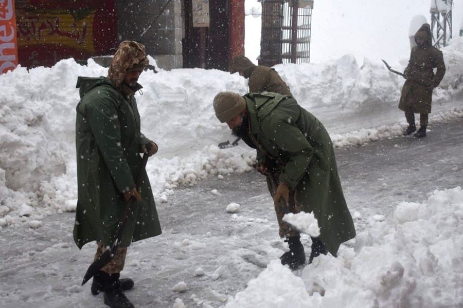 Pakistani army soldiers clear a snow-covered road in north Pakistan's Murree on Jan. 8, 2022. (Str/Xinhua)