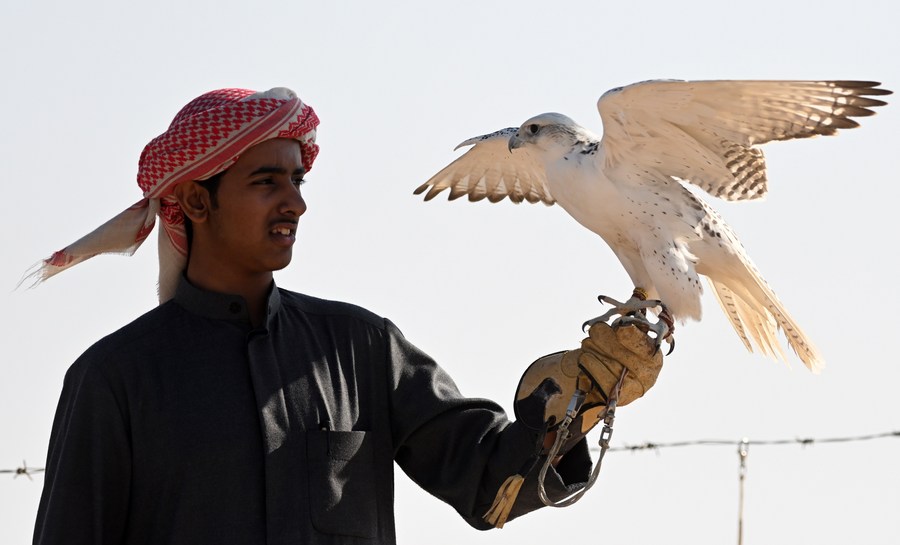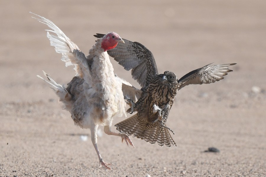 A falcon hunts during a falcon hunting show in Jahra Governorate, Kuwait, Jan. 8, 2022. (Xinhua photo)