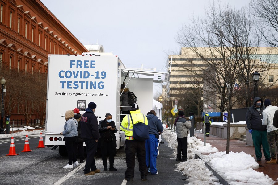 People line up for COVID-19 testing in Washington, D.C., the United States, Jan. 5, 2022. (Photo by Ting Shen/Xinhua)