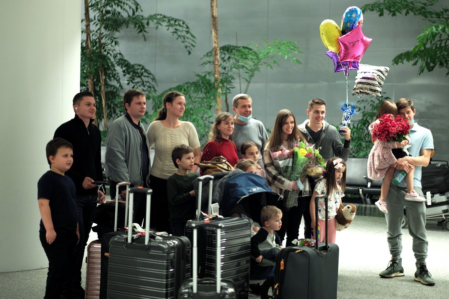 Travelling parents and their children are seen at the San Francisco International Airport in San Francisco, California, the United States, on Dec. 1, 2021.(Xinhua/Wu Xiaoling)