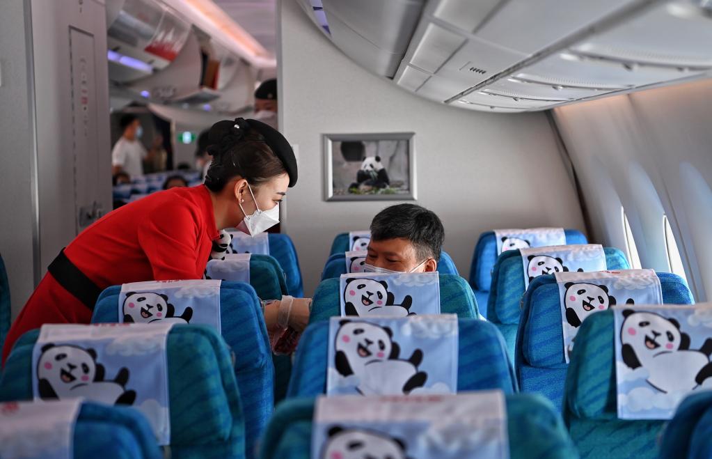 A cabin crew member explains safety guidelines to a passenger on flight 3U8001 of Sichuan Airlines at Chengdu Tianfu International Airport in southwest China's Sichuan Province, June 27, 2021. (Xinhua/Wang Xi)