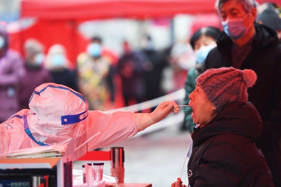 A medical worker takes swab sample for COVID-19 tests at a testing site in Zhengzhou, central China's Henan Province, Jan. 7, 2022. (Xinhua/Zhang Haoran)