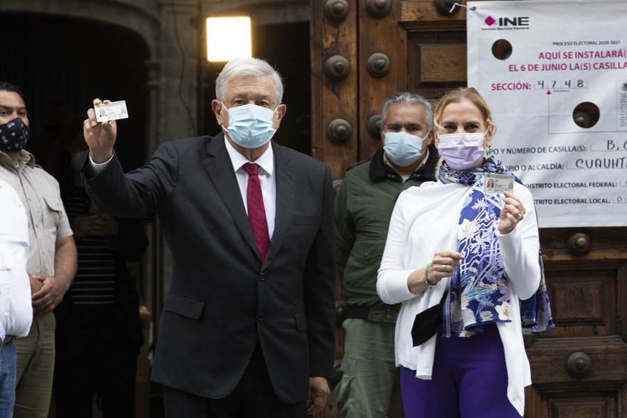 File photo taken on June 6, 2021 shows Mexican President Andres Manuel Lopez Obrador (L, Front) showing his credential before casting his ballot during the mid-term elections in Mexico City, capital of Mexico. (Str/Xinhua)■