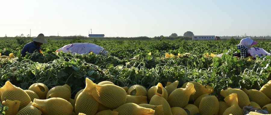 Farmers harvest Hami melons in Wujiaqu, northwest China's Xinjiang Uygur Autonomous Region, July 27, 2021. (Xinhua/Li Zhihao)