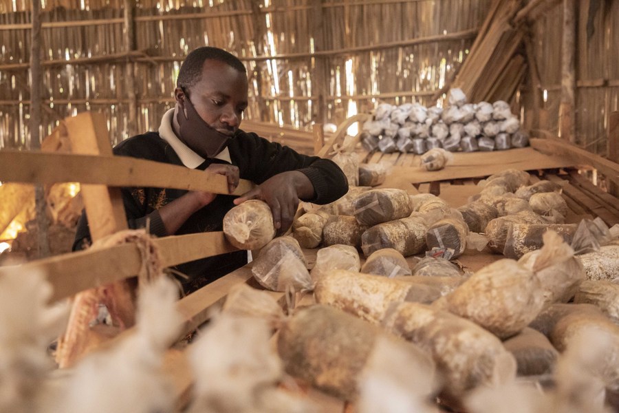 Emmanuel Ahimana, owner of a Rwandan company which applies Juncao technology to grow mushrooms, works at his workshop in Kigali, Rwanda, Sept. 9, 2020. (Xinhua/Cyril Ndegeya)