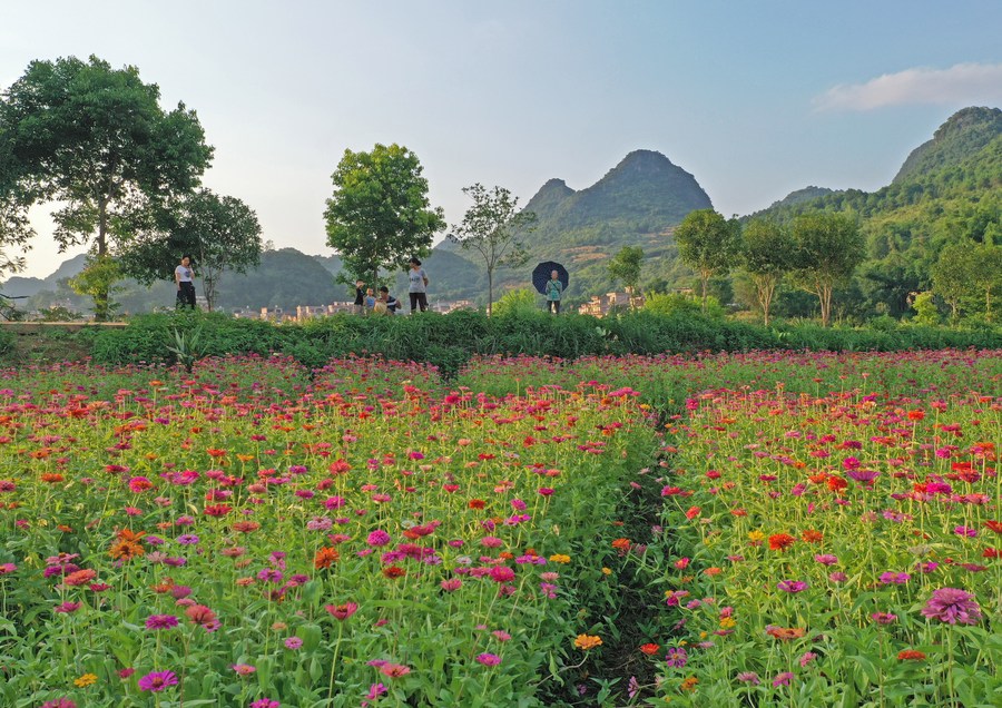 Aerial photo taken on July 14, 2021 shows visitors touring Xianghua Village of Pingle County, south China's Guangxi Zhuang Autonomous Region. As Guangxi consolidates its achievements in poverty alleviation and goes all out for rural revitalization, fostering rural industries is of great significance of advancing income growth of rural residents. (Xinhua/Zhou Hua)