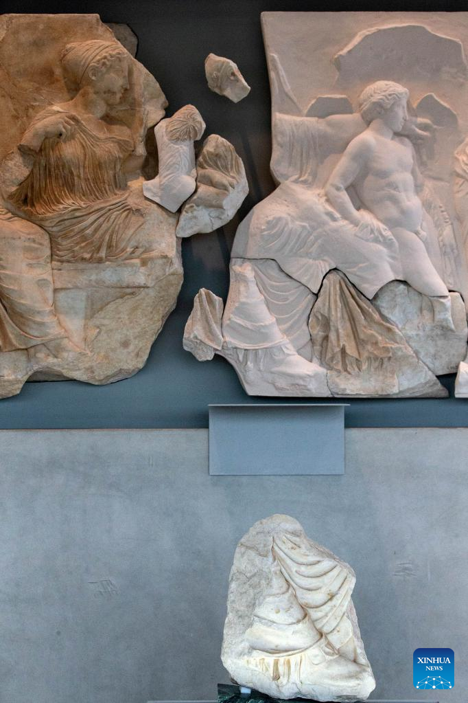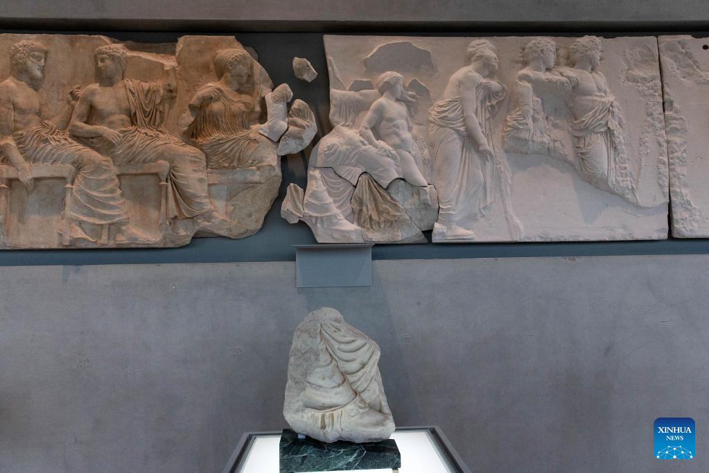 ATHENS, Jan. 10 (Xinhua) -- A fragment from the marble frieze of the 2,500-year-old Parthenon temple atop the Acropolis hill, which was returned from Italy on an eight-year loan, was put on display on Monday at the Acropolis Museum next to other segments.