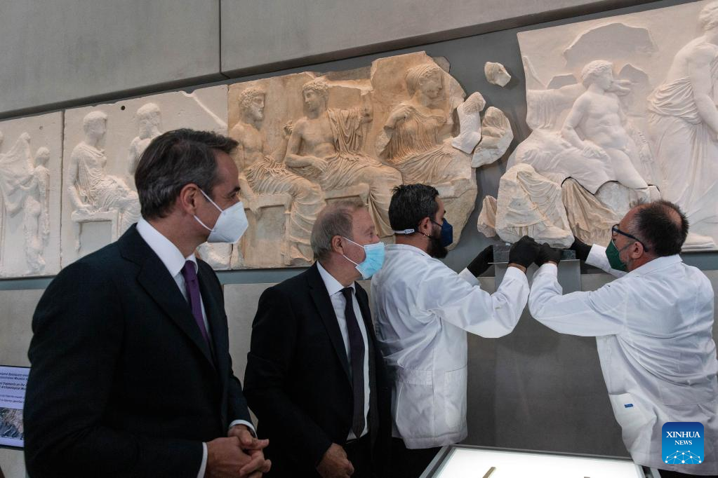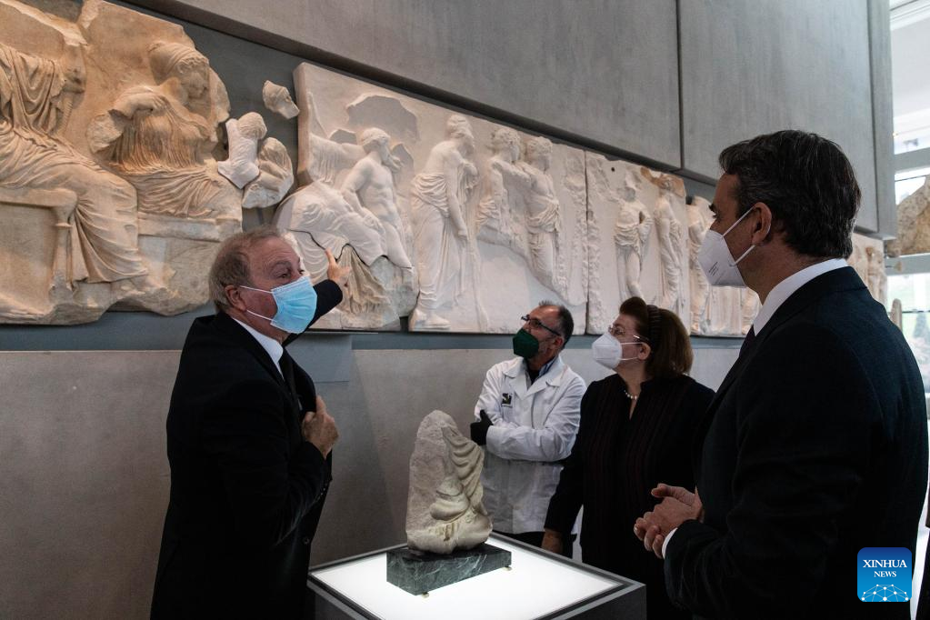 Greek Prime Minister Kyriakos Mitsotakis (1st R) looks at a fragment from the marble frieze of the Parthenon temple atop the Acropolis hill at the Acropolis Museum in Athens, Greece, Jan. 10, 2022. (Photo by Marios Lolos/Xinhua)