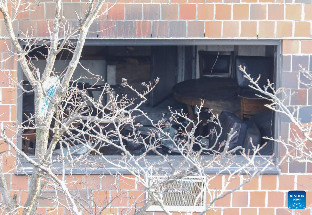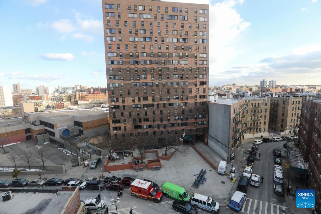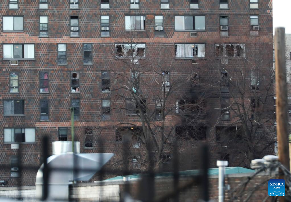 Photo taken on Jan. 10, 2022 shows the residential apartment building damaged by a major fire in the Bronx borough of New York City, the United States. The death toll from a major fire in a high-rise building in the Bronx borough of New York City was revised down to 17 from 19, according to New York City Mayor Eric Adams. (Xinhua/Wang Ying)