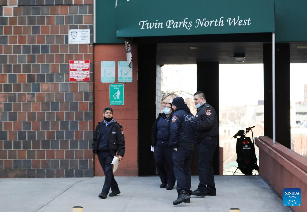 Members of New York City Fire Department walk out of the residential apartment building damaged by a major fire in the Bronx borough of New York City, the United States, Jan. 10, 2022. The death toll from a major fire in a high-rise building in the Bronx borough of New York City was revised down to 17 from 19, according to New York City Mayor Eric Adams. (Xinhua/Wang Ying)