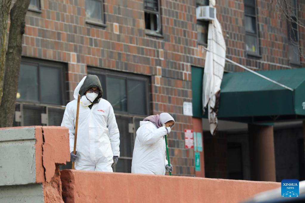 Workers clean up outside the residential apartment building damaged by a major fire in the Bronx borough of New York City, the United States, Jan. 10, 2022. The death toll from a major fire in a high-rise building in the Bronx borough of New York City was revised down to 17 from 19, according to New York City Mayor Eric Adams. (Xinhua/Wang Ying)
