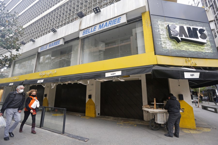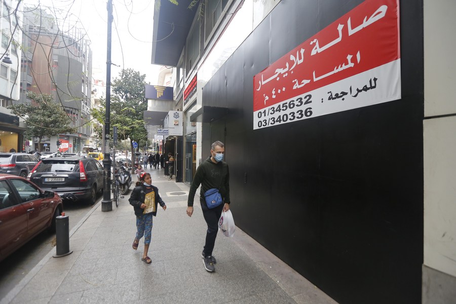 People walk past a closed store in Beirut, Lebanon, on Jan. 10, 2022. (Xinhua/Bilal Jawich)