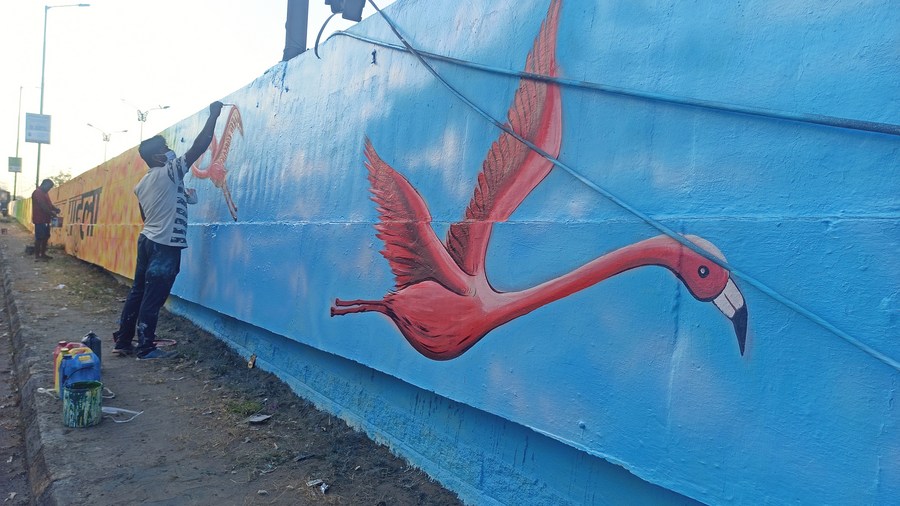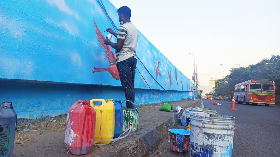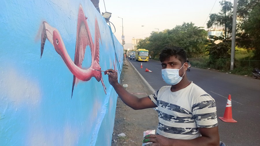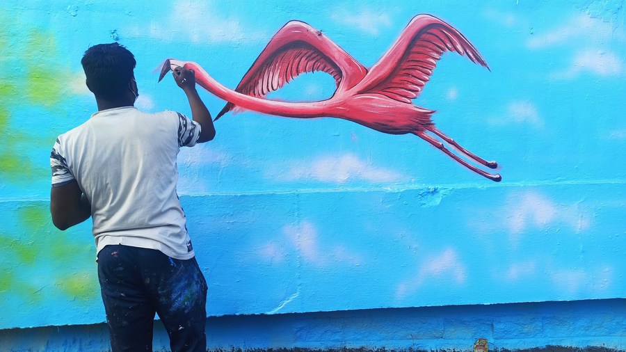 An artist gives a final touch to his flamingo artwork on the wall in Mumbai, India, Jan. 10, 2022. (Xinhua/Stringer)