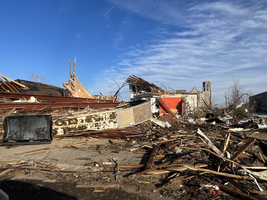 Photo taken on Dec. 11, 2021 shows houses damaged in tornadoes in Mayfield, Kentucky, the United States. Death toll may rise to 100 after at least 30 tornadoes swept through six states overnight in the central parts of the United States, including Arkansas, Mississippi, Illinois, Kentucky, Tennessee and Missouri. (Photo by Caromirna Sanchez/Xinhua)