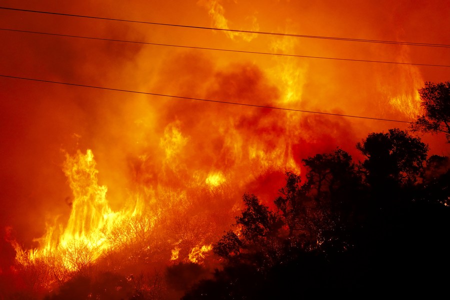 Flames and heavy smoke are seen in the Alisal Fire area, north of Santa Barbara County, California, the United States, Oct. 13, 2021. (Xinhua)