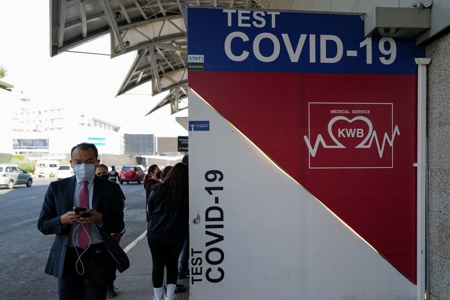 A man walks past a COVID-19 testing site at an international airport in Mexico City, Mexico, on Dec. 3, 2021. (Xinhua/Xin Yuewei)