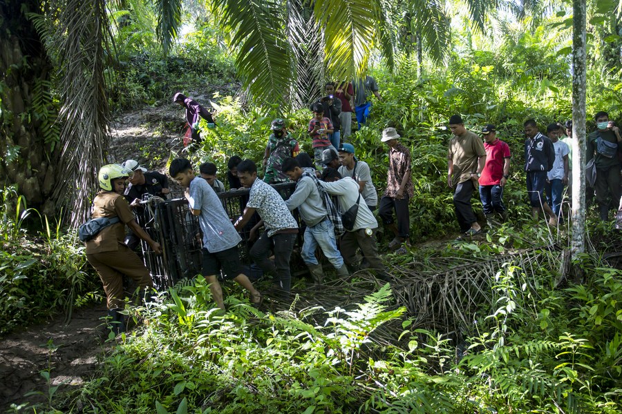 People carry a three-year-old female wild Sumatran tiger after it was rescued and evacuated by West Sumatra Natural Resources Conservation Agency (BKSDA) from oil palm plantation for observation at Mauna Hilia village in Agam district, West Sumatra, Indonesia, Jan. 11, 2022. (Photo by Andri Mardiansyah/Xinhua)