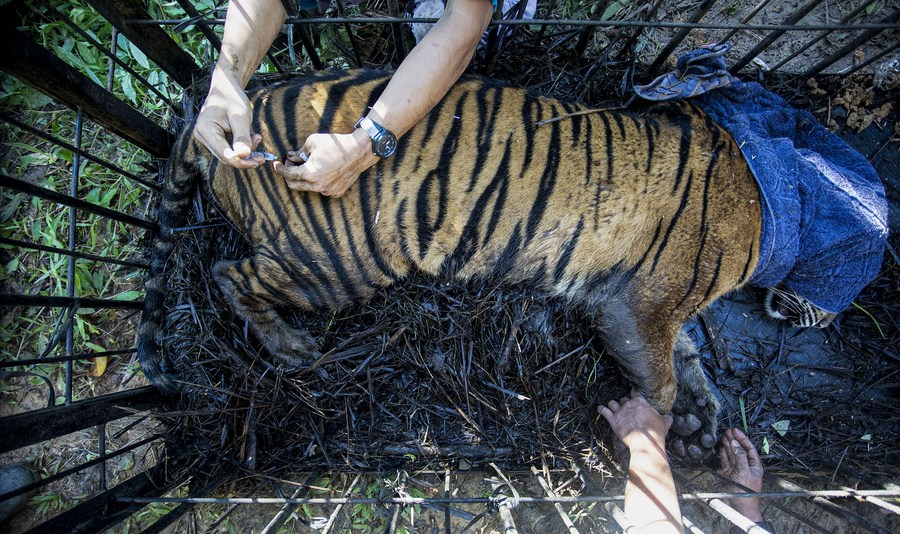 A veterinary gives a medicine to a 3-year-old female wild Sumatran tiger inside a cage after it was rescued and evacuated by West Sumatra Natural Resources Conservation Agency (BKSDA) from oil palm plantation for observation at Mauna Hilia village in Agam district, West Sumatra, Indonesia, Jan. 11, 2022. (Photo by Andri Mardiansyah/Xinhua)