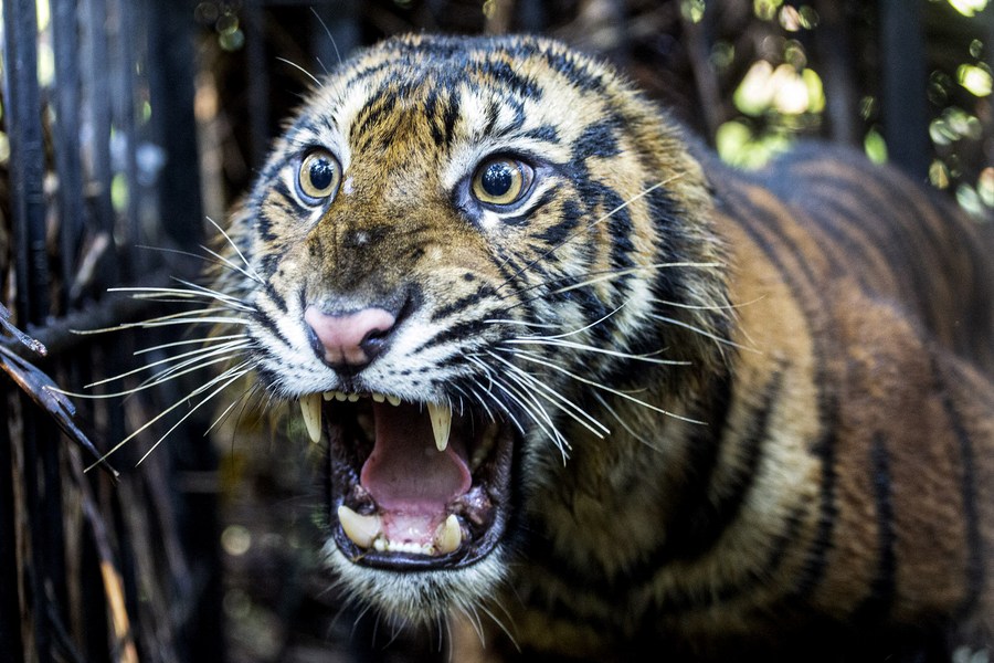A 3-years-old female wild Sumatran tiger is seen inside a cage after rescued and evacuated by West Sumatra Natural Resources Conservation Agency (BKSDA) from oil palm plantation for observation in Agam district, West Sumatra, Indonesia, Jan. 11, 2022. (Photo by Andri Mardiansyah/Xinhua)