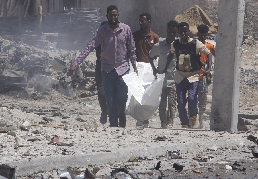 Rescuers work at the scene of a suicide car bombing attack in Mogadishu, Somalia, on Jan. 12, 2022. At least ten people including five soldiers were killed and nine others wounded in a suicide car bombing in the Somali capital, Mogadishu on Wednesday, officials said. (Photo by Hassan Bashi/Xinhua)