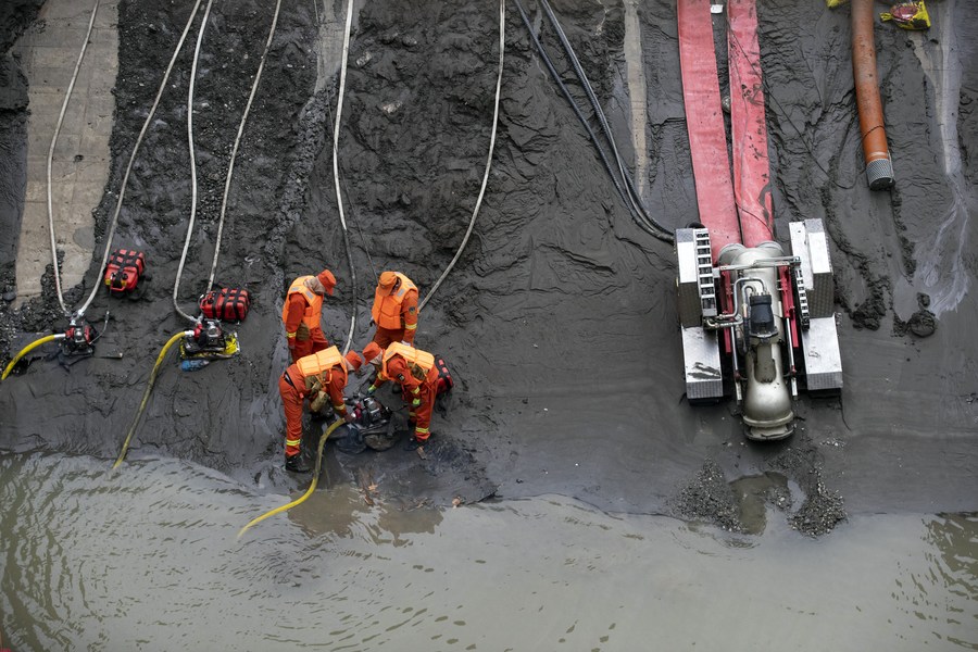 Rescuers use pumps to drain water from a building of a power station after a flooding accident in Ganzi Tibetan Autonomous Prefecture, southwest China's Sichuan Province, Jan. 13, 2022. Seven people were confirmed dead and two remained trapped after the building was flooded on Wednesday, local authorities said Thursday. (Xinhua/Shen Bohan)