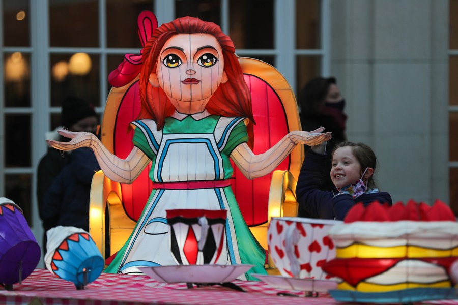 A kid poses for photos with light installations during the sixth edition of a Chinese light festival themed on "Alice in Wonderland" at the Antwerp Zoo in Antwerp, Belgium, Jan. 12, 2022. (Xinhua/Zheng Huansong)■