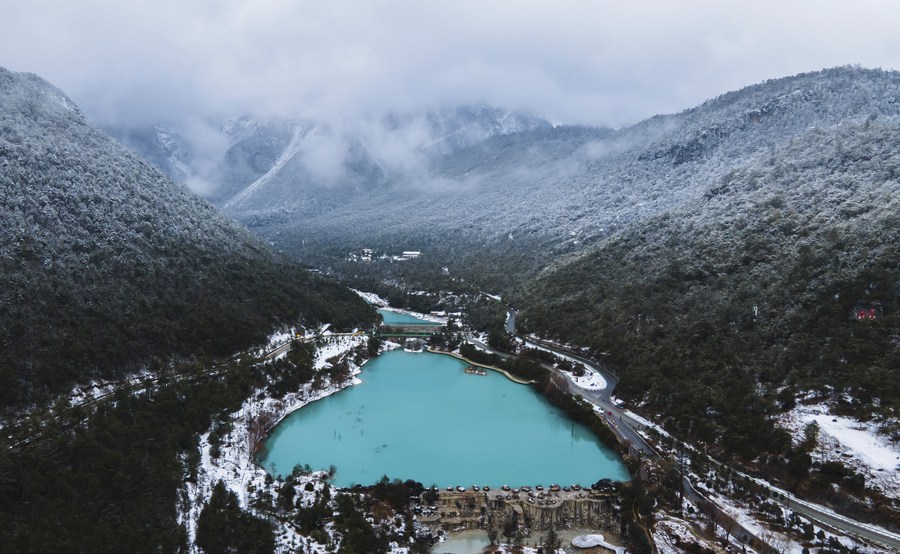Aerial photo taken on Jan. 13, 2022 shows the winter scenery of the Lanyue (Blue Moon) Valley in Lijiang, southwest China's Yunnan Province. (Xinhua/Wang Guansen)