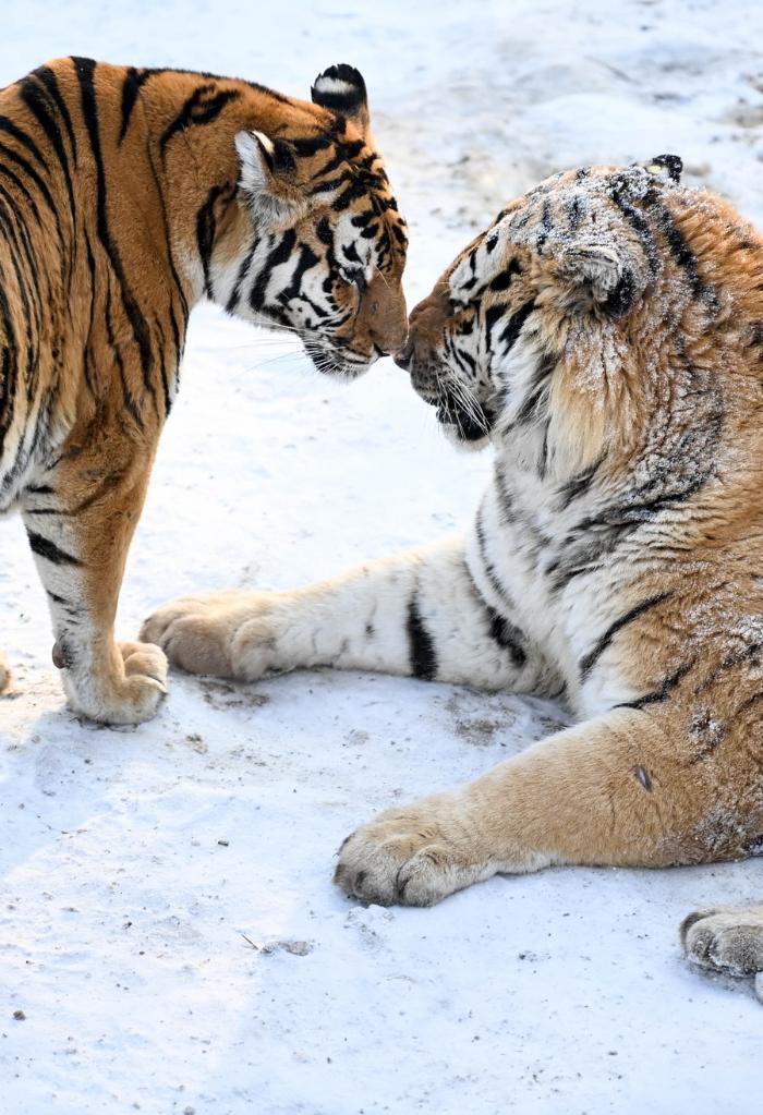 Two Siberian tigers frolic at the Siberian Tiger Park in Changchun, capital of northeast China's Jilin Province, Jan. 13, 2022. (Xinhua/Yan Linyun)