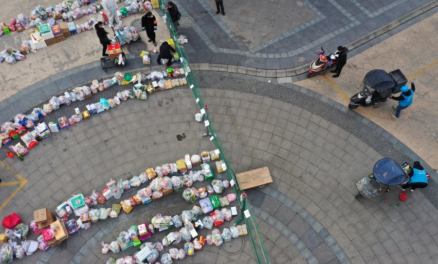 Aerial photo taken on Jan. 12, 2022 shows government workers and volunteers receiving daily necessities ordered by residents under home quarantine in Yanta District of Xi'an, capital of northwest China's Shaanxi Province. In Yuchang Sun City Community of Xi'an, 20 government staff members have been sent to join the frontline workers, and nearly a hundred volunteers are working against the clock to deliver daily necessities to residents under home quarantine. (Xinhua/Tao Ming)