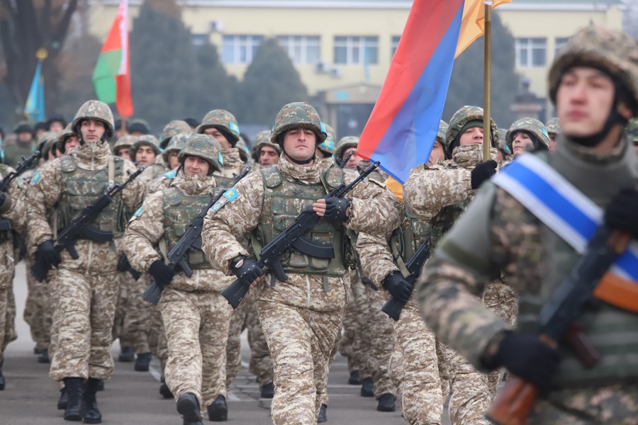 The peacekeeping forces of the Collective Security Treaty Organization (CSTO) march on a departure ceremony in Almaty, Kazakhstan, Jan. 13, 2022.