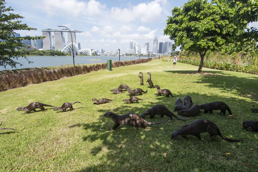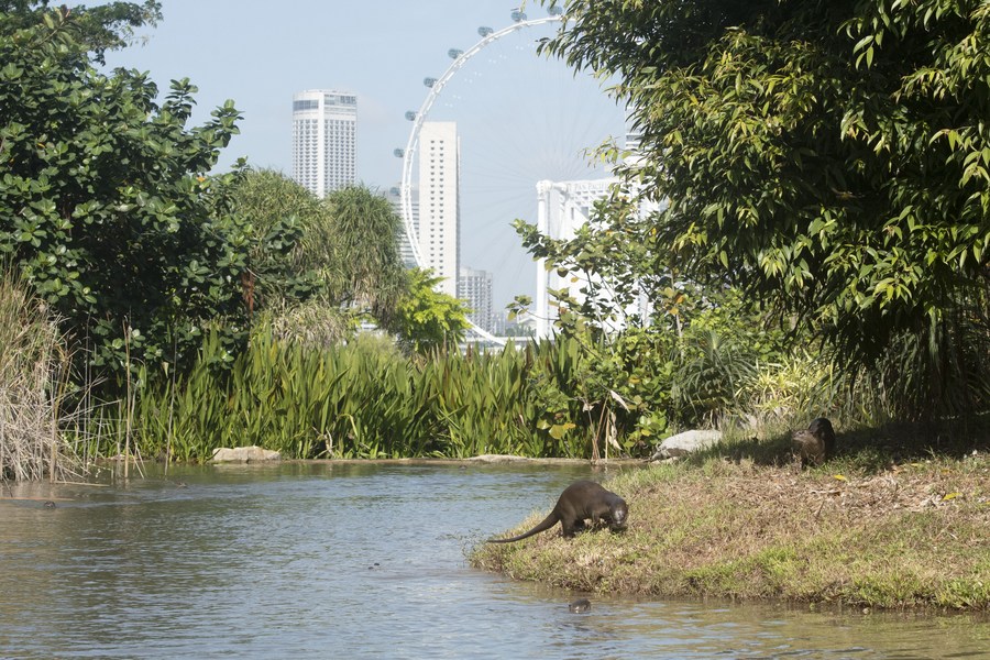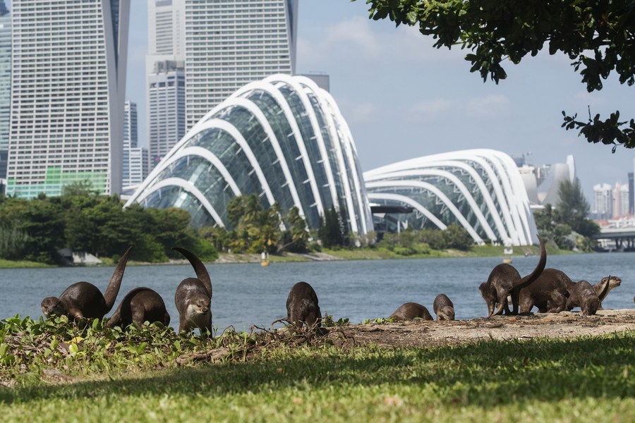 Smooth-coated otters, famously known as the Bishan family, are seen in the Gardens by the Bay East in Singapore, on Jan. 13, 2022. (Xinhua/Then Chih Wey)