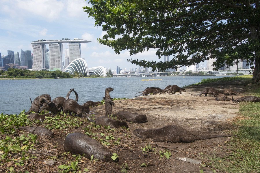 Smooth-coated otters, famously known as the Bishan family, are seen in the Gardens by the Bay East in Singapore, on Jan. 13, 2022. (Xinhua/Then Chih Wey) ■