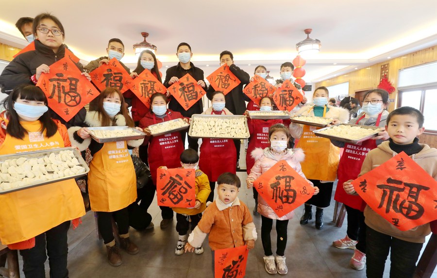 People from migrant workers' families show dumplings and Chinese character "Fu", which means good fortune, in Xinqi Village of Deqing County of Huzhou, east China's Zhejiang Province, Feb. 8, 2021. (Photo by Xie Shangguo/Xinhua)