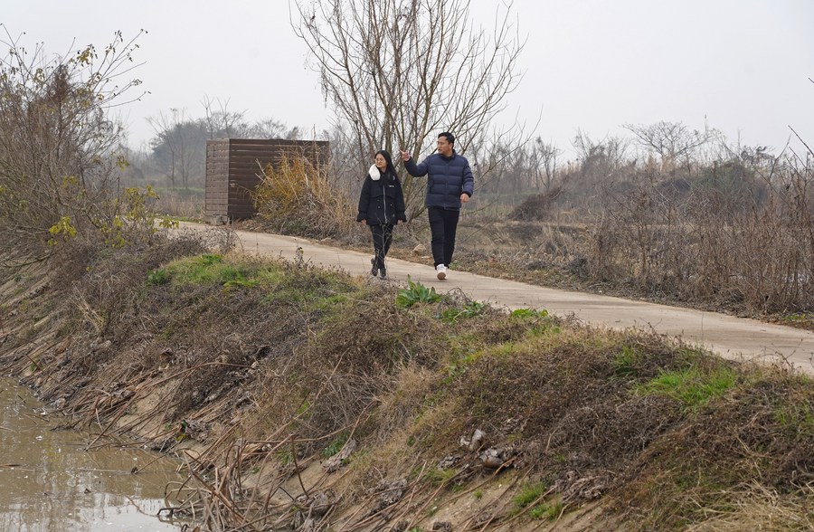 Workers patrol along the lotus pond at Nanchang Five Stars Siberian Cranes Sanctuary by the Poyang Lake in Nanchang, east China's Jiangxi Province, Jan. 12, 2022. (Xinhua/Wan Xiang)
