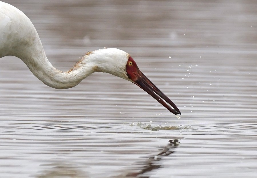 A white crane forages at Nanchang Five Stars Siberian Cranes Sanctuary by the Poyang Lake in Nanchang, east China's Jiangxi Province, Jan. 12, 2022. (Xinhua/Wan Xiang)