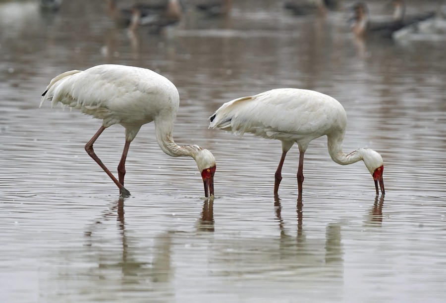 White cranes forage at Nanchang Five Stars Siberian Cranes Sanctuary by the Poyang Lake in Nanchang, east China's Jiangxi Province, Jan. 12, 2022. (Xinhua/Wan Xiang)