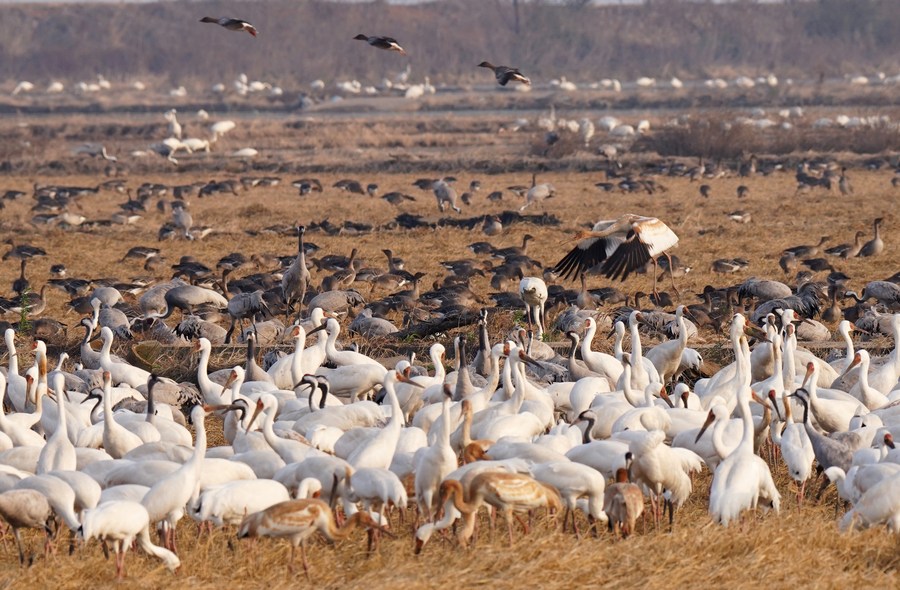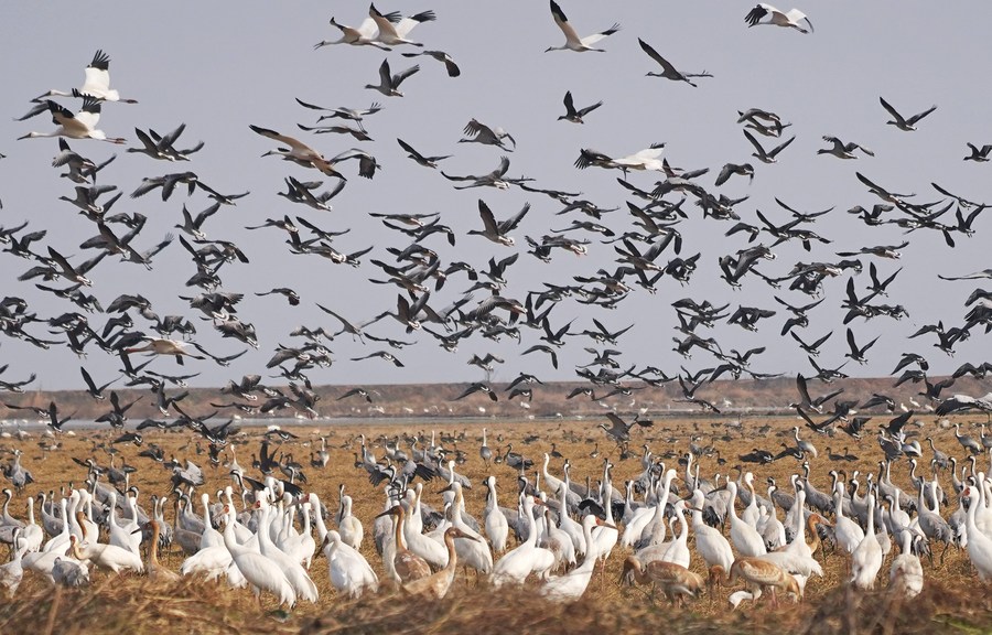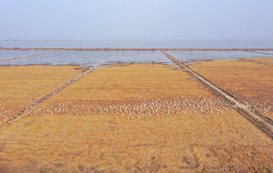 Migratory birds forage at Nanchang Five Stars Siberian Cranes Sanctuary by the Poyang Lake in Nanchang, east China's Jiangxi Province, Jan. 12, 2022. (Xinhua/Wan Xiang)