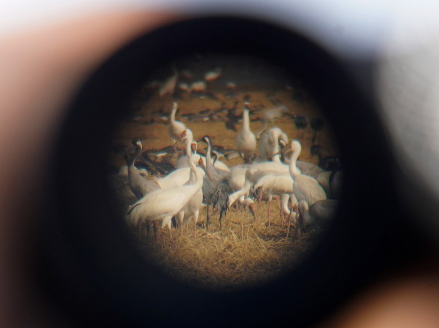 A worker observes migratory birds through telescope at a paddy field in Yugan County, east China's Jiangxi Province, Jan. 11, 2022. (Xinhua/Wan Xiang)