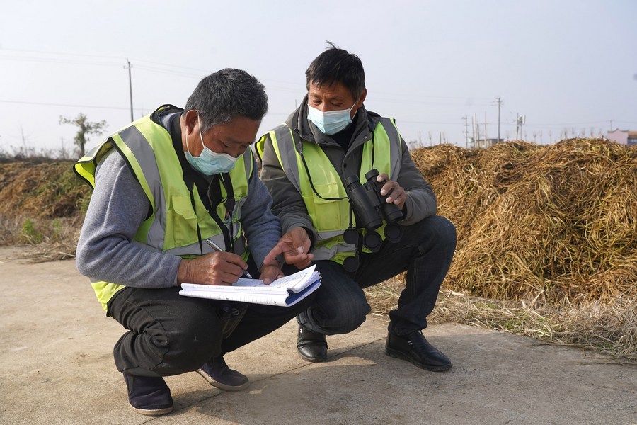 Workers calculate the number of migratory birds at a paddy field in Yugan County, east China's Jiangxi Province, Jan. 11, 2022. (Xinhua/Wan Xiang)