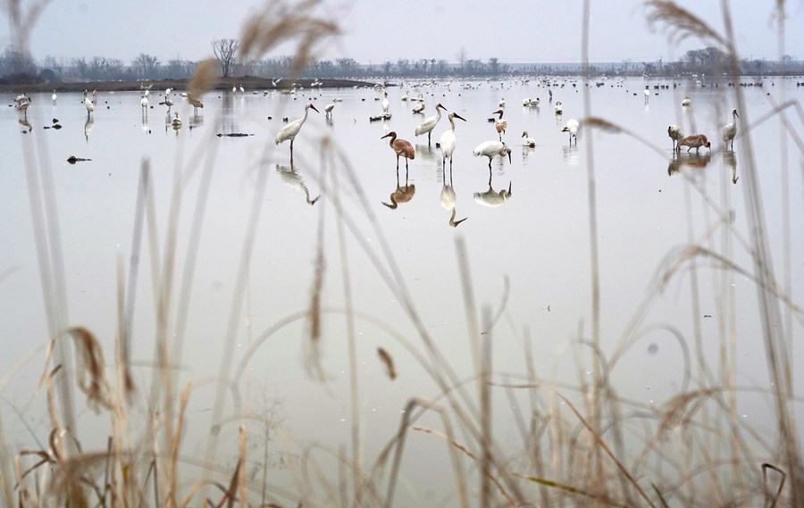 Photo taken on Jan. 12, 2022 shows Nanchang Five Stars Siberian Cranes Sanctuary by the Poyang Lake in Nanchang, east China's Jiangxi Province. (Xinhua/Wan Xiang)