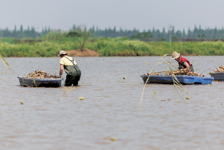 Workers plant lotus roots at Nanchang Five Stars Siberian Cranes Sanctuary by the Poyang Lake in Nanchang, east China's Jiangxi Province, April 30, 2021. (Xinhua/Wan Xiang)