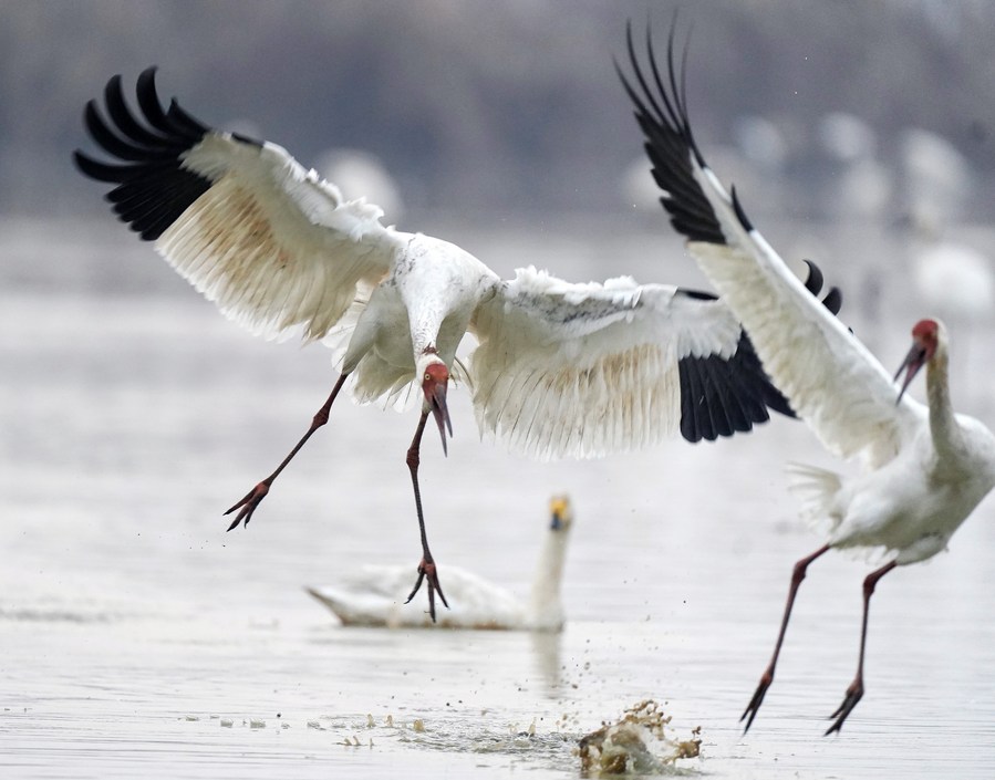 White cranes frolic at Nanchang Five Stars Siberian Cranes Sanctuary by the Poyang Lake in Nanchang, east China's Jiangxi Province, Jan. 1, 2022. (Xinhua/Wan Xiang)