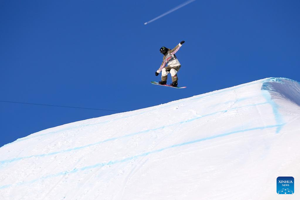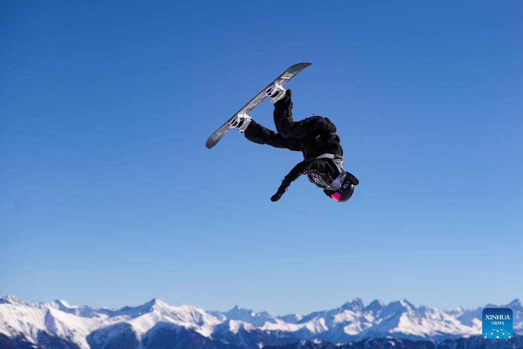 Tomita Sena of Japan competes during the women's snowboard halfpipe final at FIS Snowboard World Cup 2022 in Laax, Switzerland, Jan. 15, 2022. (Xinhua/Zhang Cheng)
