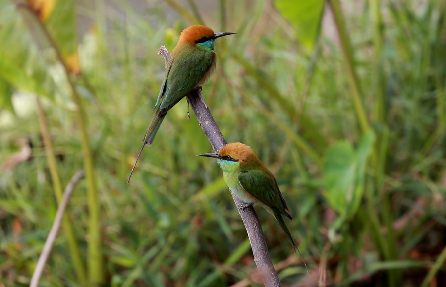 Two Chestnut-headed Bee-eaters are seen at the Moeyungyi Wetland Wildlife Sanctuary in Bago region, Myanmar, Jan. 16, 2022. (Xinhua/U Aung)