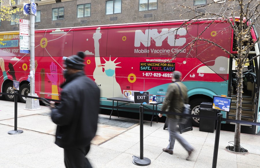 A mobile vaccine clinic is seen on a street in New York, the United States, Dec. 7, 2021. (Xinhua/Wang Ying)