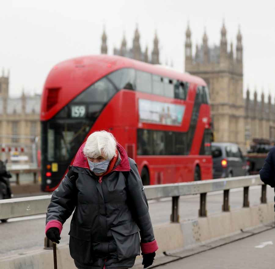 A woman wearing a face mask walks along Westminster Bridge in London, Britain, on Nov. 24, 2021. (Xinhua/Li Ying)■